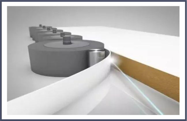 激光封邊: 通過將高能量的激光束聚合到激光封邊帶上, 高能量的激光快速融化封邊帶 的功能層, 然后通過壓輪機構, 將邊帶壓緊在工件上, 再經過截斷、初修、精修、跟蹤倒圓 等工序,從而實現封邊的目的。